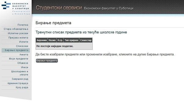 На студентском веб сервису са леве стране у менију изабрати „Бирање предмета“.