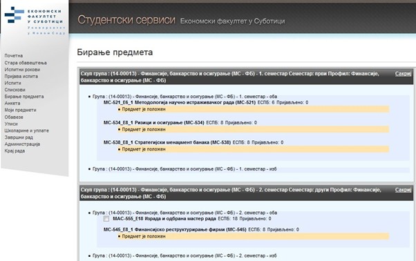 Да бисте изабрали предмете или променили изабране предмете, кликните на дугме „Бирање предмета“. Након тога се отвара форма у којој је потребно изабрати жељене предмете.